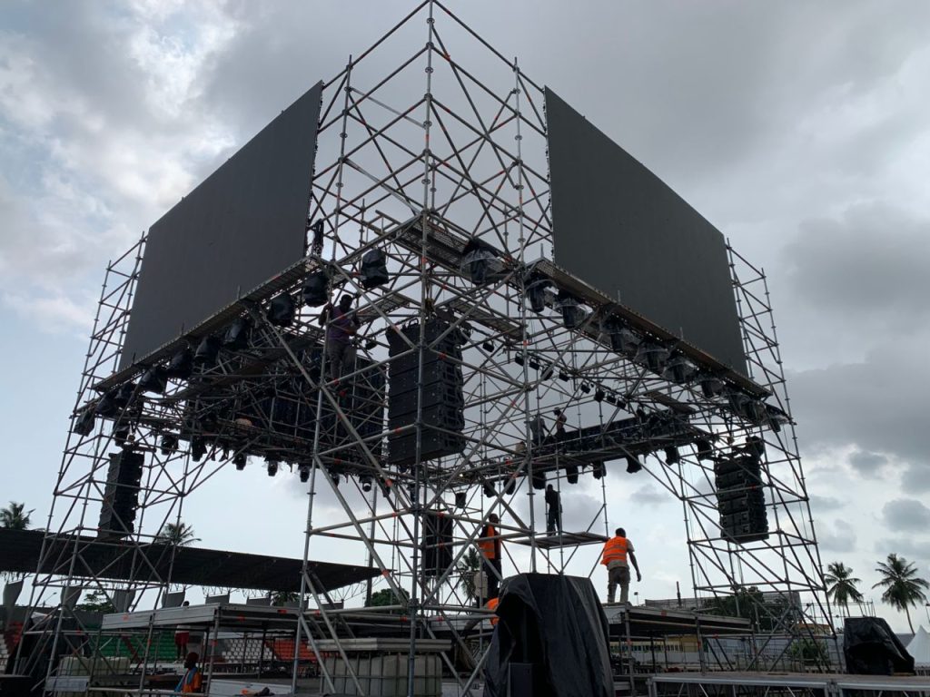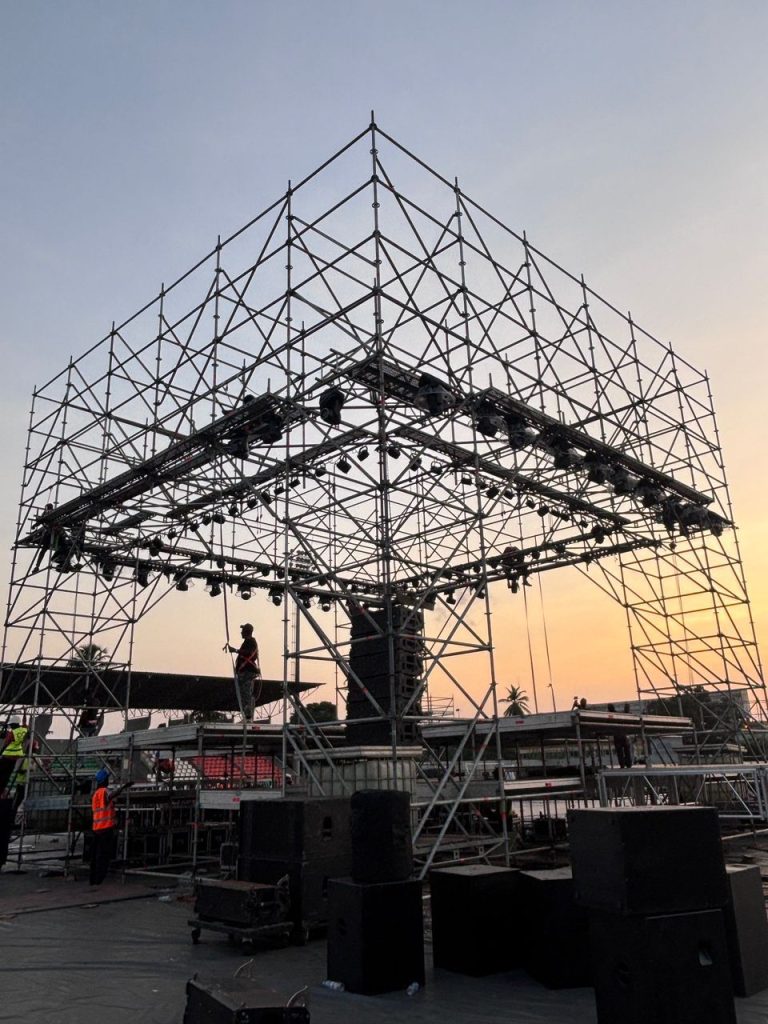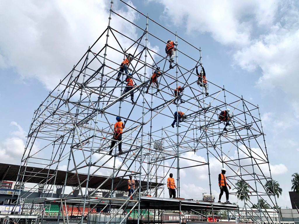 À l’occasion de ce rendez-vous unique, Layher Côte d’Ivoire Échafaudage a contribué à la réalisation d’une scène inédite à 360°, une première en Côte d’Ivoire. Cette configuration innovante a permis aux spectateurs de bénéficier d’une visibilité optimale du podium, quel que soit leur emplacement dans le stade, offrant ainsi une expérience immersive et inclusive.